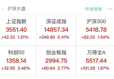 截至收盘,沪指涨1.21%%报3551.4点,深成指涨2.41%报14857.34点,创业板指涨2.77%报2994.75点;两市合计成交8732亿元,北向资金净流入37.86亿元。