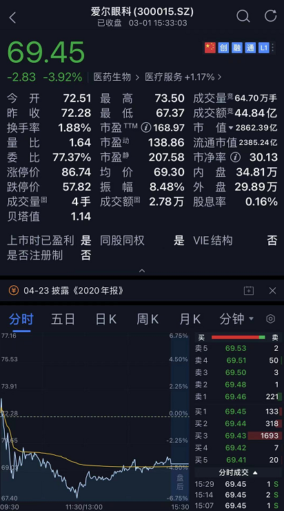 不过“眼茅”爱尔眼科却逆势大跌,一度跌超6%,消息面上,出现了黑天鹅事件,去年12月31日被知名医生、武汉市中心医院急诊科主任艾芬“硬怼”后,爱尔眼科又遭前员工“非议”。微博用户“幽灵满世界彩虹”(爱尔眼科前员工)自曝称,其本人于2017年3月入职重庆爱尔麦格眼科医院,2017年8月在该院做了屈光手术,由于术前主刀医生未按要求对手术方案及手术后遗症、禁忌症等进行详细沟通,该名员工术后第一天裸眼视力0.25,经过三年多治疗,双眼裸眼视力依然下滑至0.05,矫正视力仅0.2。