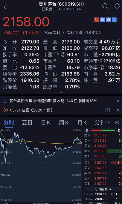 贵州茅台大涨近2%,消息面上,《贵州日报》日前报道称,2020年茅台集团营业收入、利润总额分别增长13.7%和18.2%,该增速超过了茅台集团此前定下的10%的业绩增长目标。