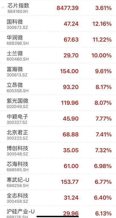芯片指数大涨3.6%,A股中芯国际涨超4%,港股中芯国际涨超8%。国科微涨超12%、立昂微涨8%、士兰微涨停,博创科技、紫光国微、北京君正、华润微均涨超7%。