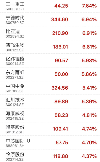 再来看看茅台指数,今天大涨2%,其中“新能源茅”宁德时代涨近7%,比亚迪涨6.91%,“免税茅”中国中免涨超5%,“安防茅”海康威视涨4%,“猪茅”牧原股份涨超4%。