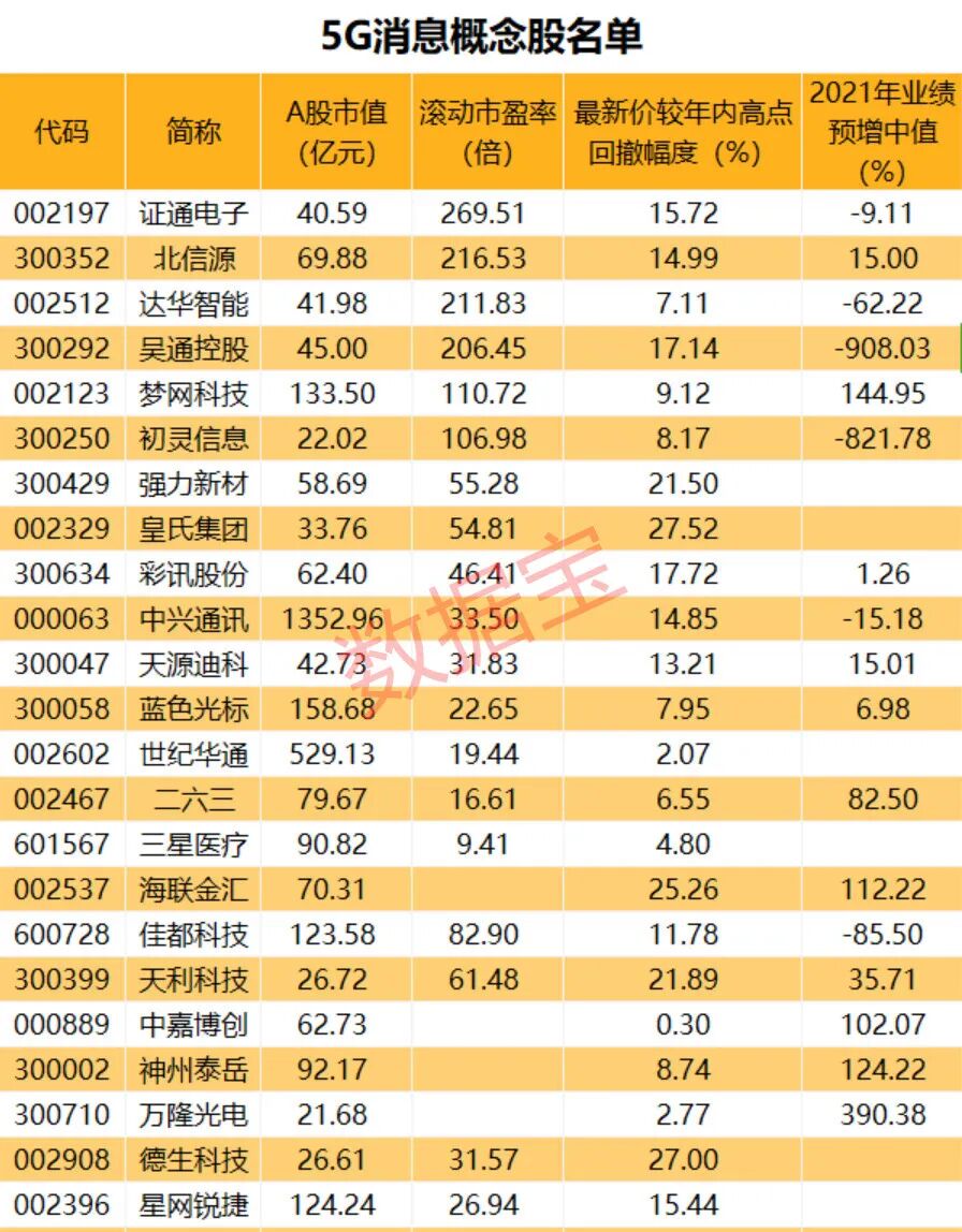 据证券时报·数据宝统计,5G消息概念股有20余只。概念股近一周表现稳健,平均上涨3.18%,跑赢同期大盘。世纪华通领涨,涨幅13.06%。中嘉博创、万隆光电涨幅居前,涨超10%。