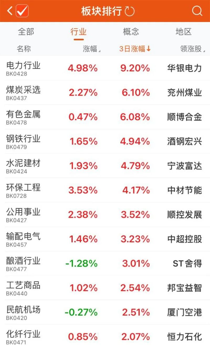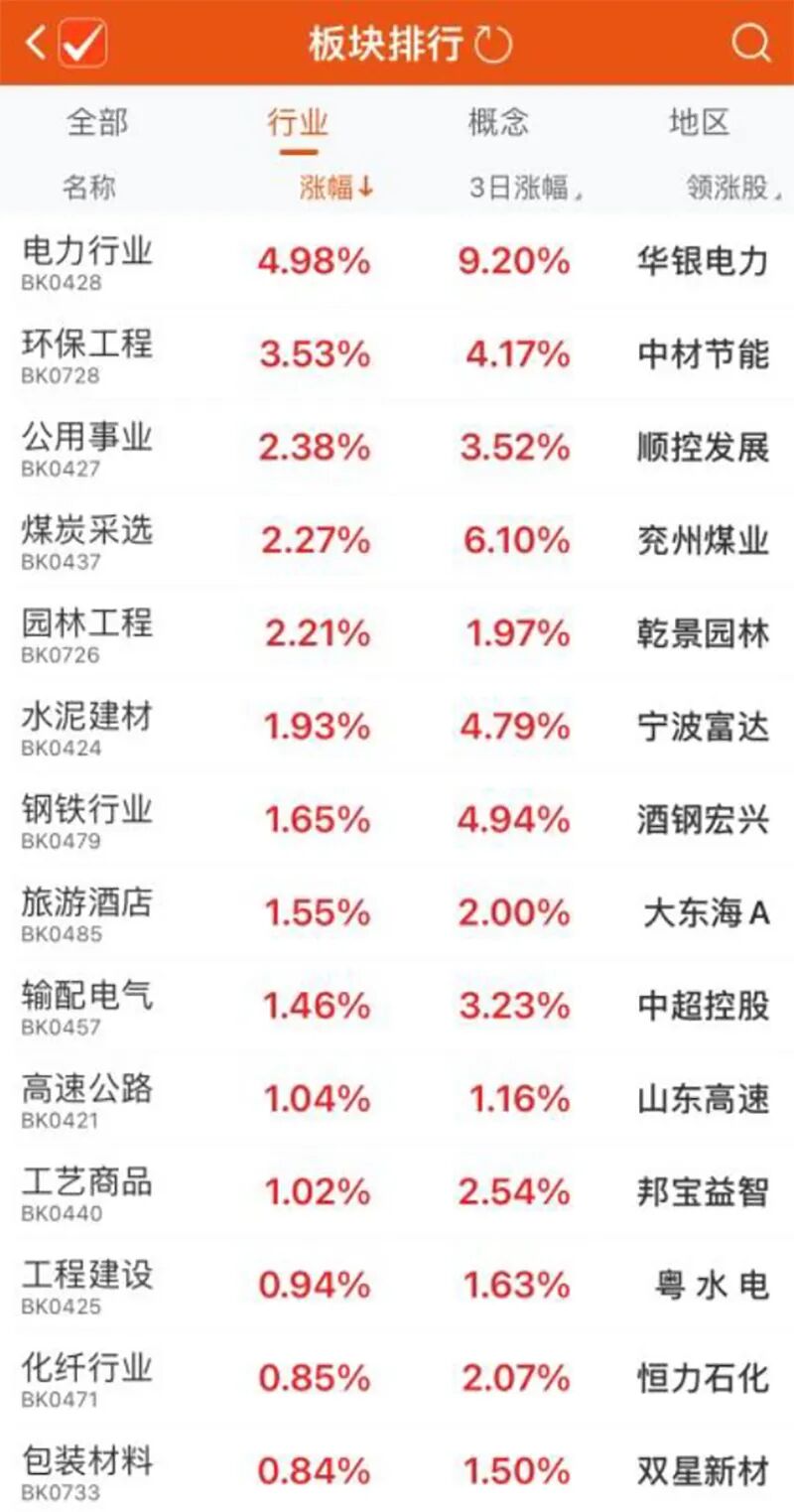 除环保板块外,电力板块同样掀涨停潮,华能水电两连板,长江电力涨幅近8%;水泥、电解铝行业或优先纳入全国碳交易市场,相关板块大幅拉升,华新水泥涨逾6%;兖州煤业涨停,再创多年新高,提振煤炭板块;碳中和概念中最早启动的钢铁板块同样强势,酒钢宏兴两连板。