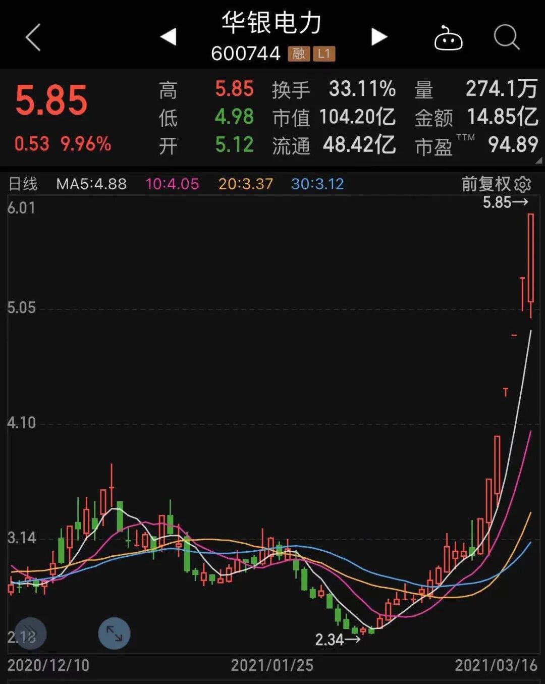 华银电力表现最为抢眼,截至昨日收盘,3月以来累计涨幅90%,堪称碳中和概念领涨龙头。加上今天早上的涨停板,华银电力连续涨停达到7次。昨日晚间,华银电力发布风险提示公告称,公司股价短期涨幅较大,估值远高于同行业公司;公司主营火力发电,且主要发电资产均在湖南省内;2020年,公司收到深圳排放权交易所有限公司分红金额8.82万元,参股投资对公司经营业绩影响较小。