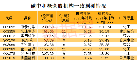 根据5家以上机构一致预测数据,部分碳中和概念股2021年业绩值得期待。数据显示,8股2021年净利润有望同比增长10%以上,分别是中泰化学、东珠生态、华测检测、维尔利、国检集团等。中泰化学净利润预增幅度最高,机构一致预测其净利润为19.37亿元,同比增长13.19倍。