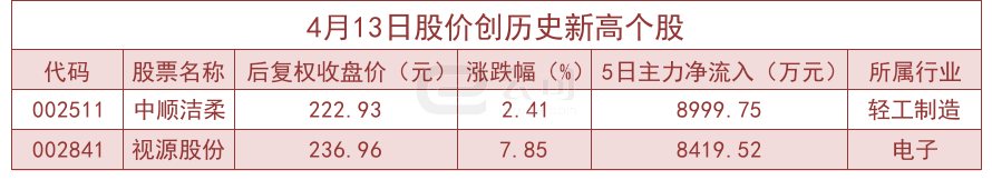 截止4月13日最新收盘,两市共有2只个股股价创历史新高。其中中顺洁柔、视源股份等5日主力资金净流入较为明显。