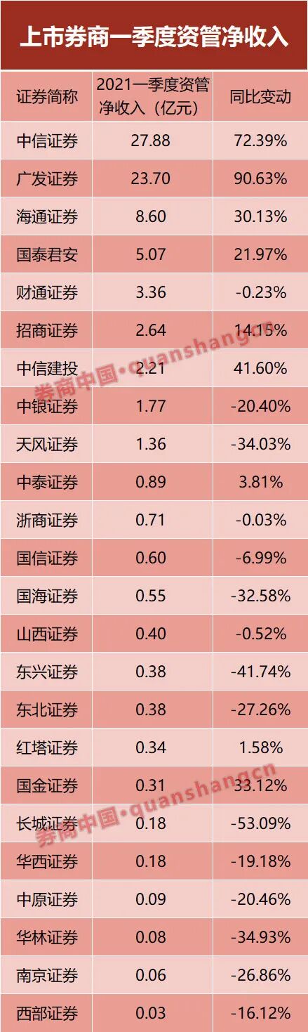 今年是资管新规整改大限,券商主动管理能力明显增加。今年一季度24家上市券商合计实现81.79亿元资管净收入,同比增幅43.36%。其中中信证券、广发证券分别实现27.88亿元、23.70亿元资管净收入,同比增幅分别为72.39%、90.63%,明显优于其他券商,不过各家券商统计口径有所不同,可能会影响最终的呈现结果。
