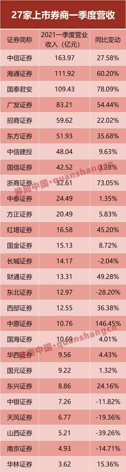 营收来看,目前已披露业绩的上市券商一季度合计实现909.8亿元营收,同比增幅23.24%。中信证券、国泰君安、海通证券三家券商一季度营收均超100亿,其中中信证券以163.97亿元营收位居行业第一,同比增幅27.58%。