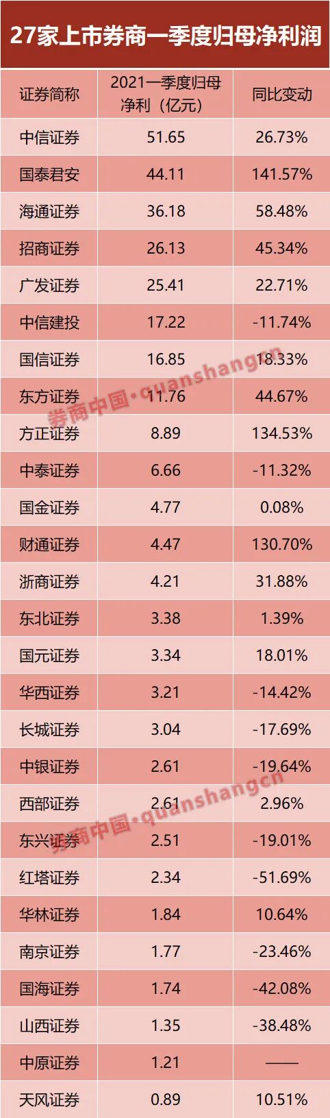 已披露业绩的27家上市券商今年一季度合计实现290.14亿元归母净利润,同比增幅31.74%。其中中信证券以51.65亿元归母净利排名第一,同比增幅26.73%;国泰君安、海通证券一季度归母净利润均超35亿,位列二、三位。