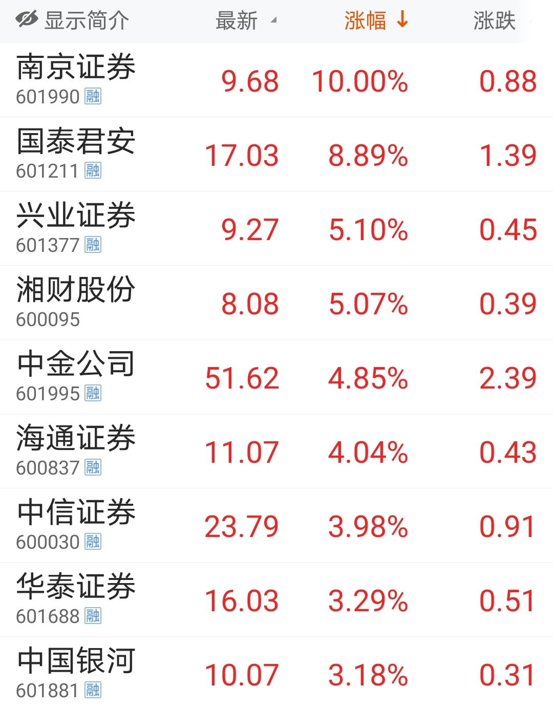 4月29日,券商概念股集体大涨,截至收盘,9只券商股涨幅超过3%,南京证券涨停。头部券商股表现突出,国泰君安大涨8.89%,兴业证券涨超5%、中金公司涨4.85%,海通证券涨超4%,中信证券、华泰证券均涨超3%。