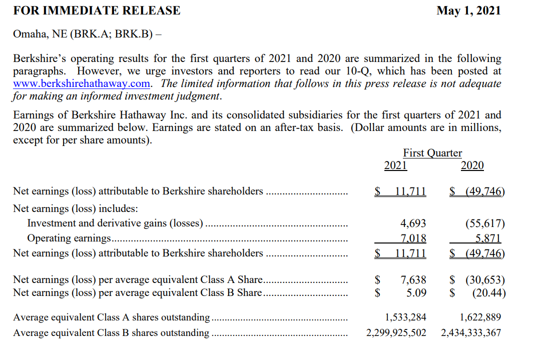 伯克希尔哈撒韦在一份声明中说:“任何给定季度的投资收益(亏损)通常是没有意义的,它提供的每股净收益数字可能会给那些几乎不了解会计规则的投资者造成极大的误导。”