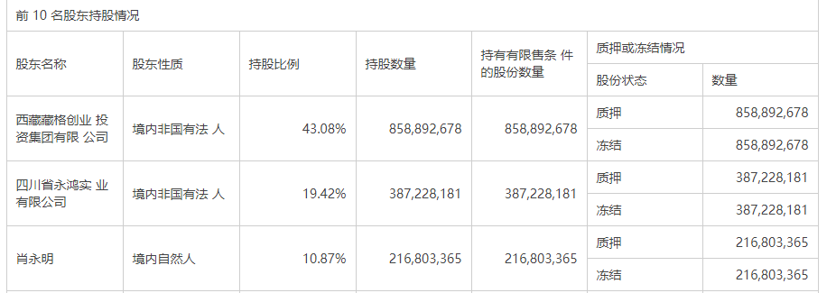 公司一季报显示,藏格控股控股股东藏格集团及其一致行动人永鸿实业、肖永明、林吉芳累计被冻结股份数量为14.67亿股,占其所持公司股份数量比例达到100%。