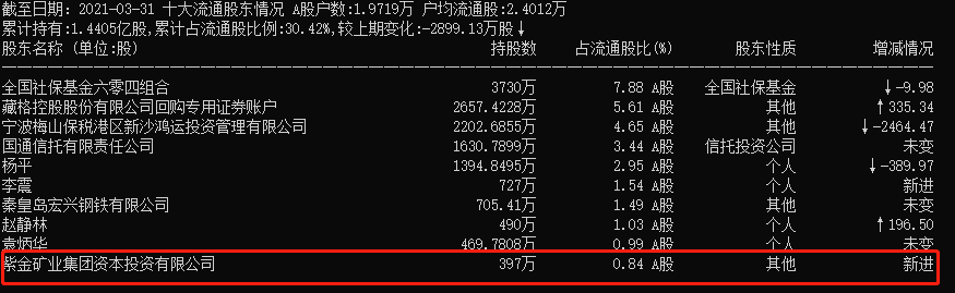值得一提的是,公司20201年一季度前十大流通股中,新进紫金矿业(601899)全资子公司集团资本投资有限公司,持股数量为397万股,占公司流通股本的0.84%。