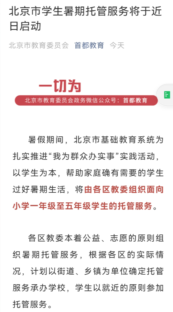 7月2日,北京市教委微信公众号发布消息称,北京市学生暑期托管服务将于近日启动。