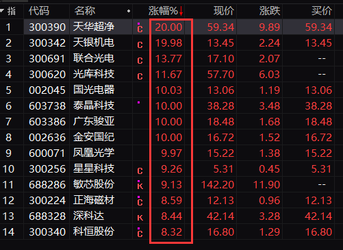 元器件板块其他个股中,天银机电尾盘午后也冲上涨停。联合光电、光库科技、国光电器、泰晶科技、广东骏亚、金安国纪、凤凰光学等多只个股大面积上涨。