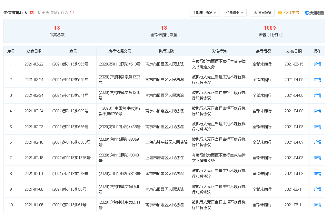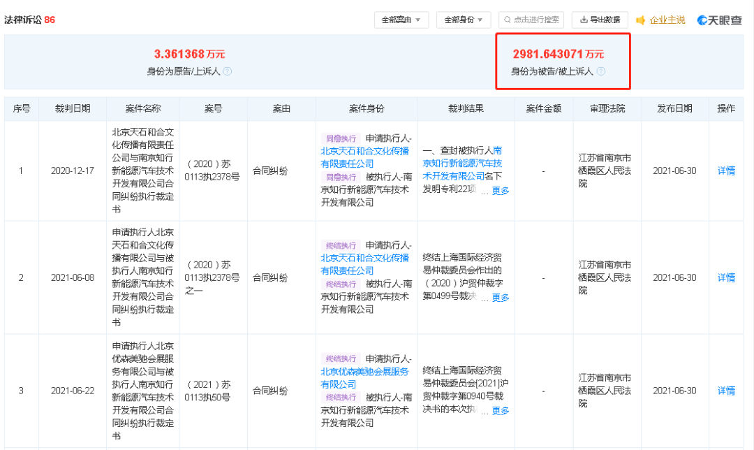 值得注意的是,截至最新,南京知行新能源汽车技术开发有限公司已有数十则终本案件、限制消费令等。