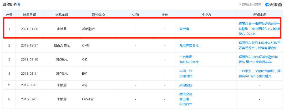 随后,市场传出拜腾汽车已启动新一轮融资。丁青芬表示,“新一轮融资将以债转股的方式,由拜腾汽车现股东优先认领。” 随后,天眼查显示,1月6日,富士康进行了战略融资。