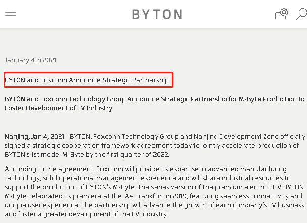 就在大家觉得拜腾就此完了的时候,2021年1月4日,拜腾汽车发布公告,拜腾已经与富士康、南京经济开发区签署战略合作框架协议,共同在 2022 年第一季度前加快生产拜腾的量产。