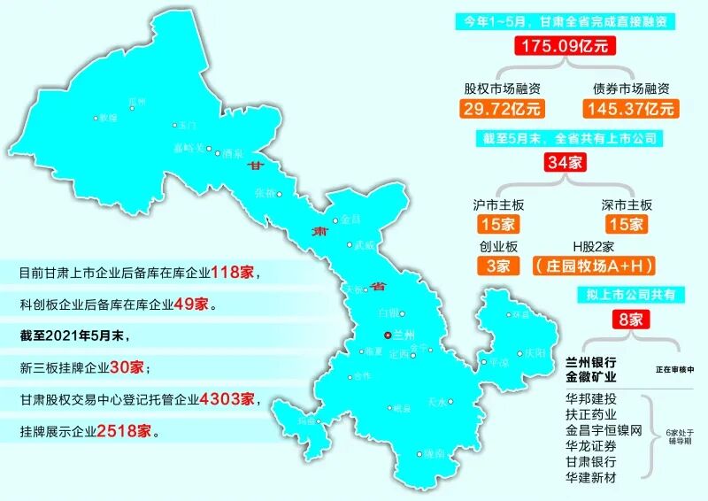 今年1~5月,全省完成直接融资175.09亿元,其中,股权市场融资29.72亿元,债券市场融资145.37亿元。截至5月末,全省共有上市公司34家,其中,沪市主板15家,深市主板15家、创业板3家,H股2家(庄园牧场A+H)。拟上市公司共有8家,兰州银行、金徽矿业正在审核中,华邦建投、扶正药业、金昌宇恒镍网、华龙证券、甘肃银行、华建新材6家处于辅导期。