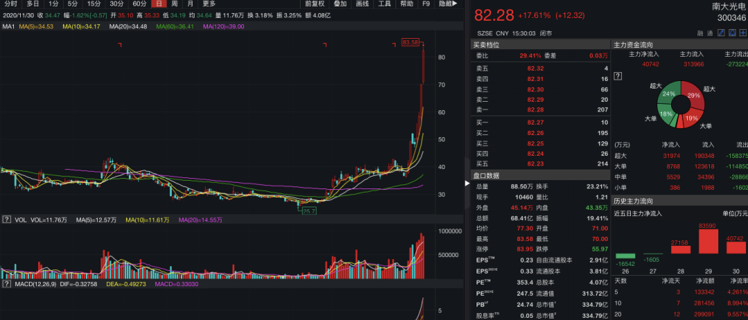 个股方面,以南大光电为例,今年7月已经上涨109.89%,目前市值335亿元,PE达到248;晶瑞股份7月以来上涨69.49%,市值205亿元,PE132;上海新阳7月以来上涨14.7%,市值194亿元,PE155。