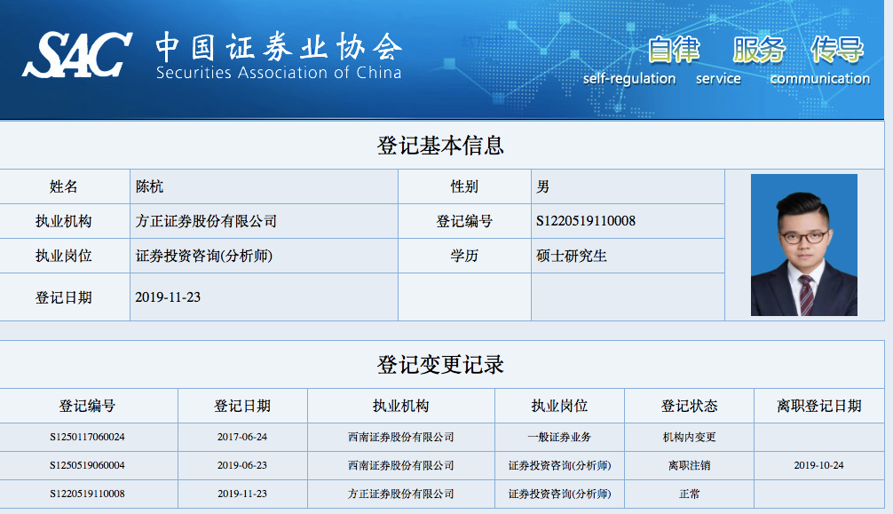 券商中国记者注意到,尽管群内备注陈杭为西南电子分析师,但是根据中证协信息,陈杭毕业于北京大学计算机硕士,2017年6月加入西南证券,直到2019年6月23日获得分析师资格成为西南证券电子分析师,2019年11月,陈杭跳槽到方正证券研究所,担任科技与电子首席分析师,这意味,陈杭担任分析师时长大约2年多时间。