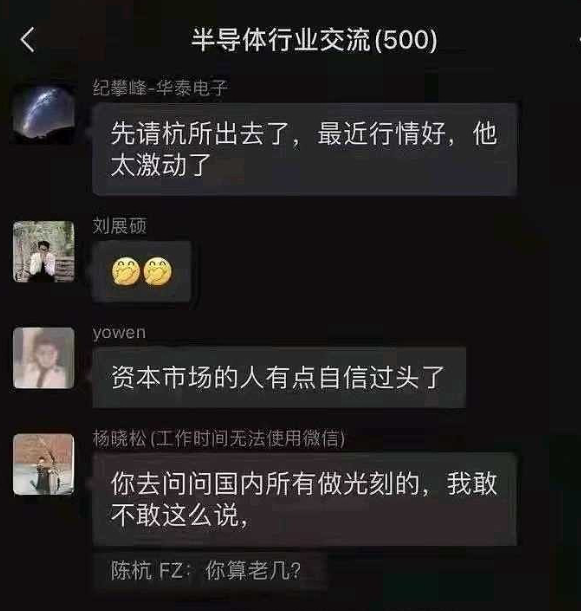 近日,在一个半导体行业500人的微信群内,全球缺芯持续之下,行业正在就国内半导体领域紧缺的“光刻胶”耗材国产化进行交流,但是对于光刻胶以及中芯国际看法上,方正证券首席电子分析师陈杭,与中芯国际光刻胶负责人杨晓松产生观点分歧,由此,他怒怼杨晓松“你算老几”,一时令行业诧异不已。