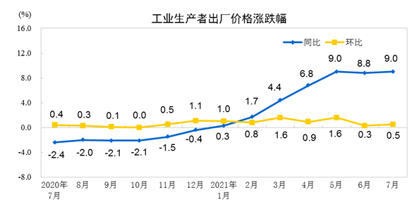 e公司讯,国家统计局:7月份,全国工业生产者出厂价格同比上涨9.0%,环比上涨0.5%;工业生产者购进价格同比上涨13.1%,环比上涨0.9%。1—7月平均,工业生产者出厂价格比去年同期上涨5.7%,工业生产者购进价格上涨7.9%。