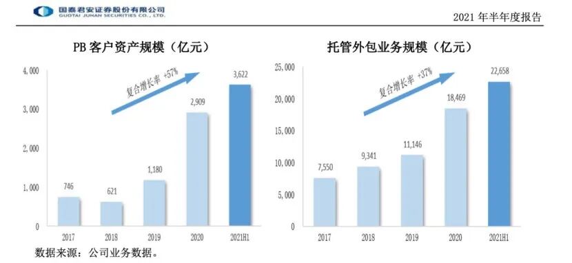 报告期内,PB交易系统交易量2.3万亿元,同比增长165.2%,期末客户资产规模3622亿元、较上年末增长24.5%。报告期末托管外包各类产品14610只、较上年末增长22.7%,规模22658亿元、较上年末增长22.7%,其中,托管私募基金数量排名证券行业第2位,托管公募基金规模1268亿元、继续排名证券行业第1位。