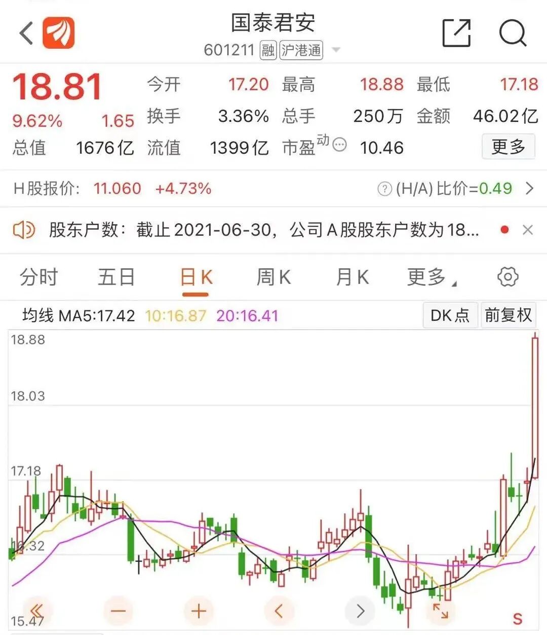 8月24日,国泰君安股价大涨,盘中一度触及涨停,最终报收18.81元/股,涨幅达到9.62%,总市值1676亿元。