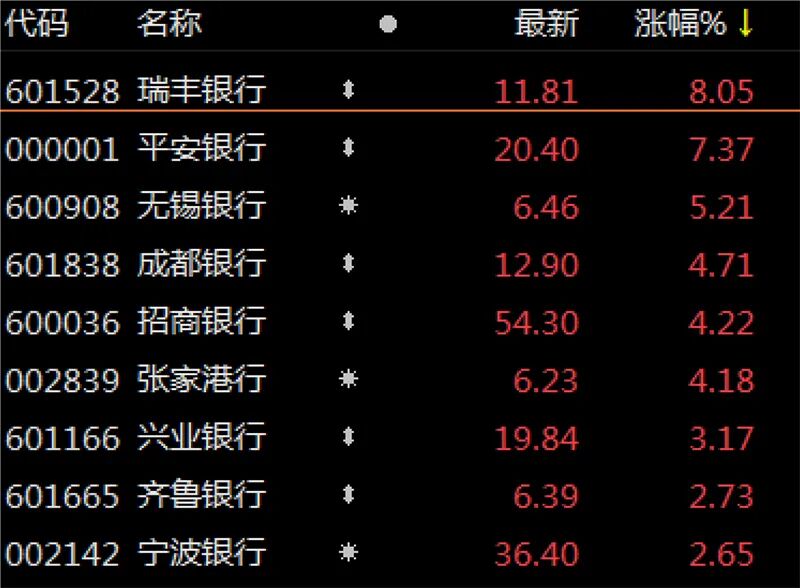 在沪指震荡回落后,银行板块接过领涨大旗,瑞丰银行、平安银行、无锡银行等纷纷上涨,带动沪指大幅回升。