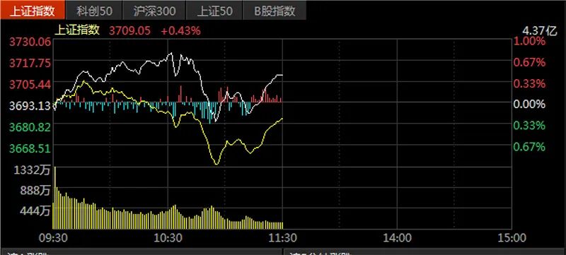 今日,券商板块早盘强势上攻,在券商板块带动下,上证指数在开盘半个小时后突破3700点整数关口。随着券商、白酒等板块涨幅持续扩大,上证指数最高触及3722.87点。
