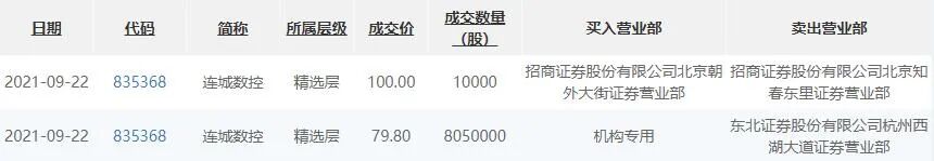 在今日的大宗交易上,出现了连城数控和吉林碳谷2只精选层股票的身影。连城数控今日在大宗交易出现了两笔交易,其中一笔成交了805万股股票,成交价79.8元较今日收盘价121.58元折价逾三成,值得注意的是,该买入席位为机构专用,合计斥资6.42亿元。