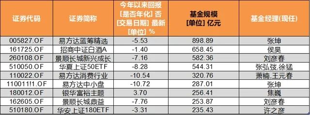 在亏损队伍中,最为显眼的有三只基金,易方达蓝筹精选(005827)、招商中证白酒A(161725)、景顺长城新兴成长(260108),这三只基金规模均超过500亿元,是当前公募基金中的顶流。它们的基金经理分别为张坤、侯昊、刘彦春,也是基金舆论场中的明星。