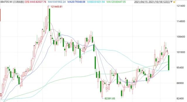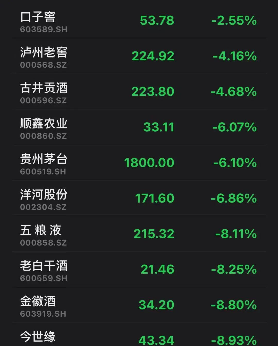 10月18日收盘,白酒行业全线暴跌,酒鬼酒(000799)、山西汾酒(600809)、迎驾贡酒(603198)、海南椰岛(600238)4股封死跌停,还有舍得酒业(600702)、水井坊(600779)等5股跌幅超过9%,即使是贵州茅台(600519)也跌6.1%,收报1800元,上周涨幅已全部丢失。