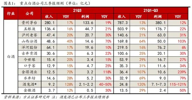 方正证券认为大部分酒企Q3业绩有所保障,行业向上趋势不改;华泰证券观点表示高端白酒旺季量价平稳,景气延续,次高端延续分化,其预计贵州茅台、五粮液、泸州老窖的21Q3实现营业收入同比分别为13%、17%、23%。