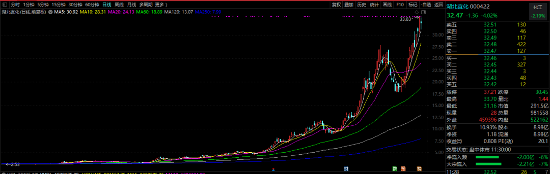 值得一提的是,湖北宜化或成为今年首只十倍股。数据宝统计显示,湖北宜化年内涨幅已超过957%,距离十倍股仅一步之遥。