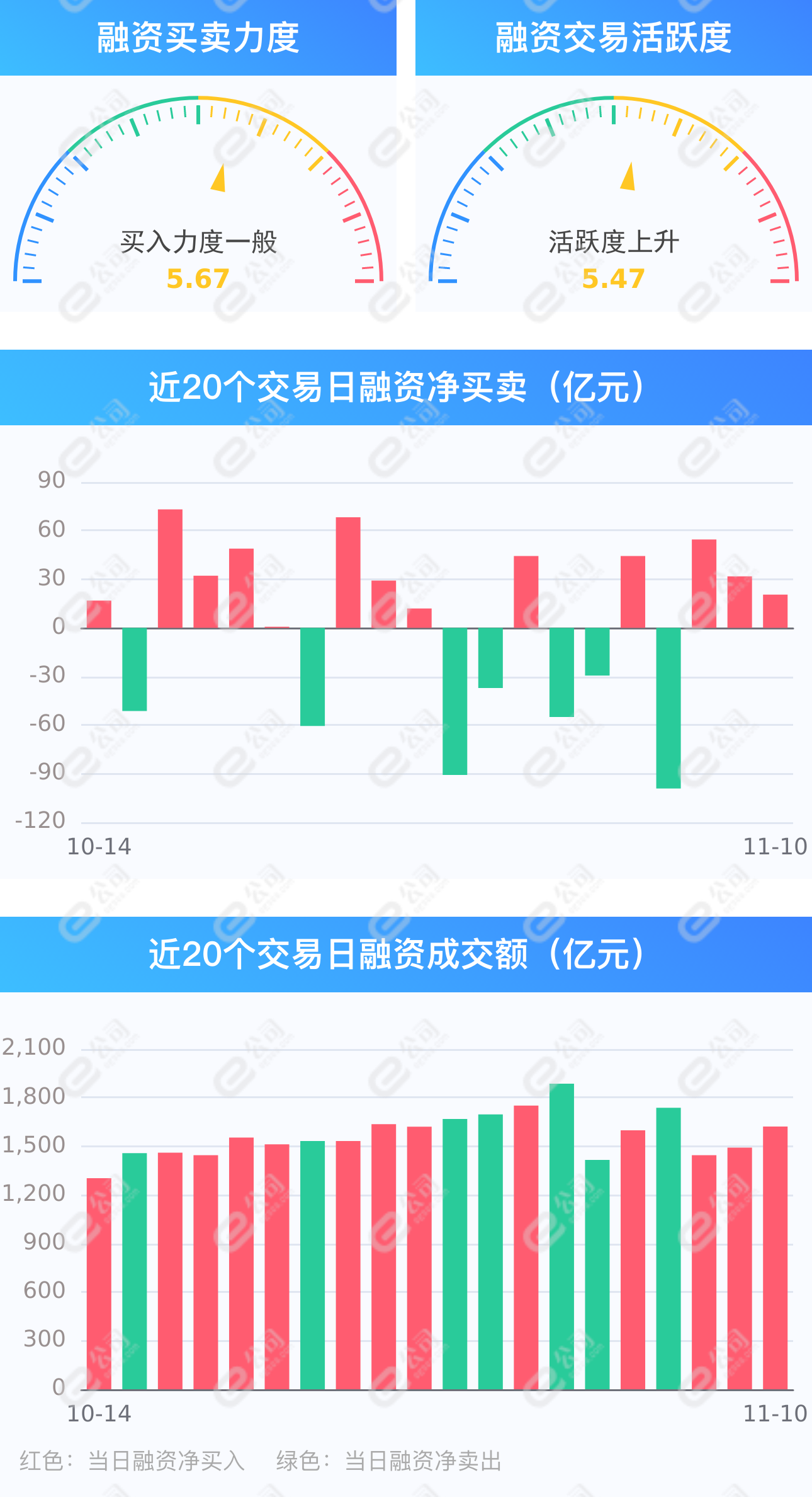 e公司讯,截至11月10日,上交所融资余额报8993.32亿元,较前一交易日增加6.24亿元;深交所融资余额报7986.52亿元,较前一交易日增加14.23亿元;两市合计16979.83亿元,较前一交易日增加20.47亿元,融资交易额1621.55亿元,占A股成交额15.12%,其中融资买入额821.01亿元,融资偿还额800.54亿元,交易活跃度上升8.73%。(此稿由证券时报e公司写稿机器人“快手小e”完成。)