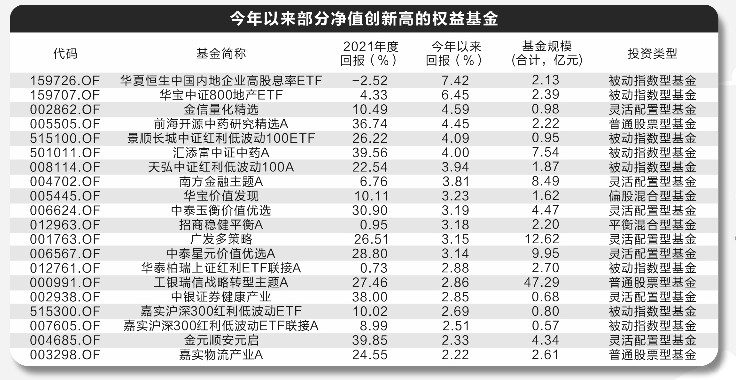 e公司讯,新年伊始,A股风格大变,新能源、半导体、军工等赛道股高位剧烈震荡,稳增长板块强势崛起,高低切换明显。记者梳理发现,今年以来有36只权益基金净值创下新高,还有中庚小盘价值、中泰玉衡价值优选、中欧恒利三年定开、中庚价值灵动灵活配置、中欧潜力价值A和广发价值领先A等去年的高增长、低回撤基金产品表现强势。除此之外,开年以来,以地产产业链、银行为代表的稳增长板块表现稳健,也是不少基金净值飘红的最大催化剂。
