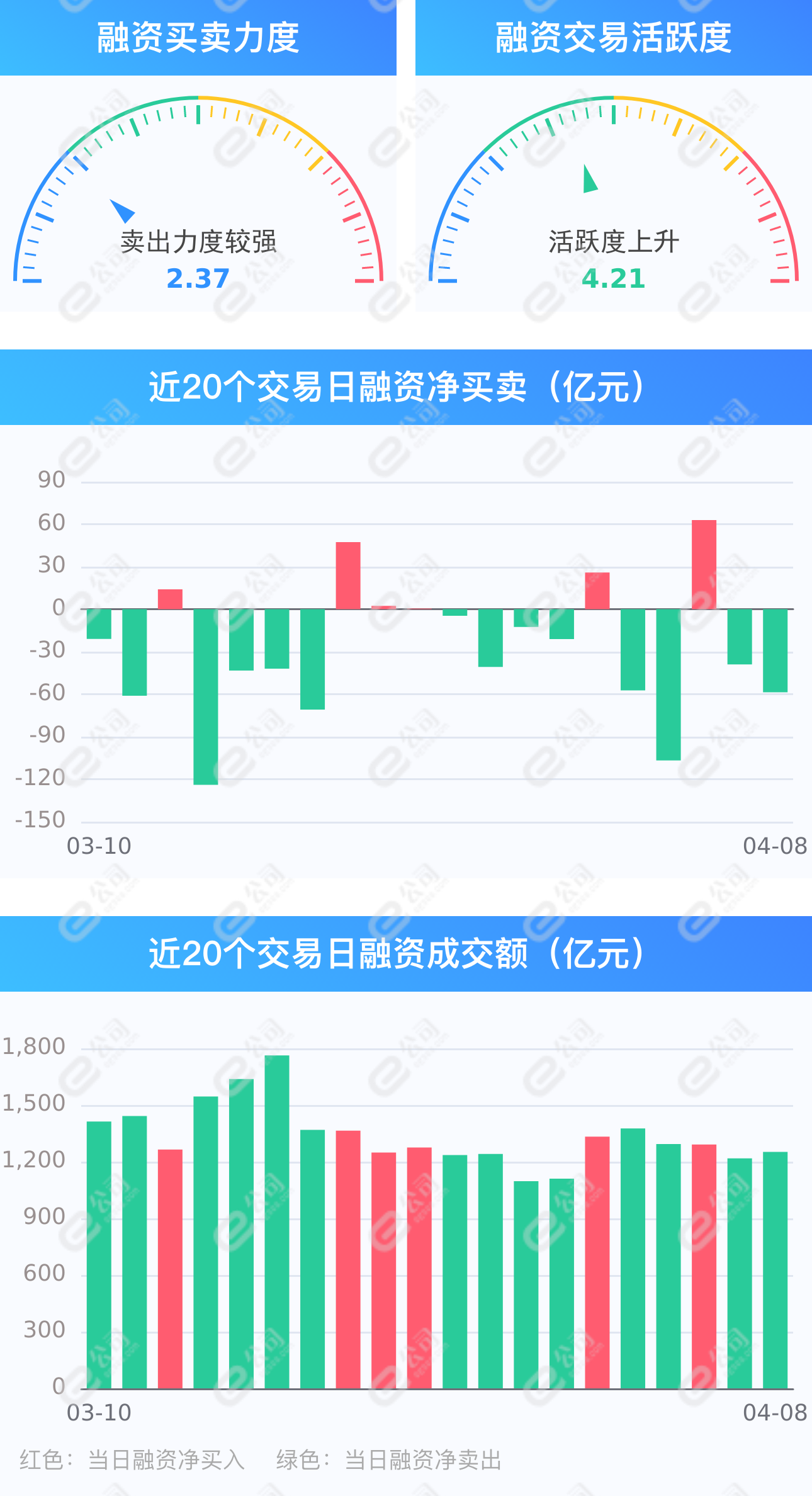 e公司讯,截至4月8日,上交所融资余额报8288.37亿元,较前一交易日减少28.69亿元;深交所融资余额报7377.02亿元,较前一交易日减少29.93亿元;两市合计15665.39亿元,较前一交易日减少58.63亿元,融资交易额1251.44亿元,占A股成交额13.59%,其中融资买入额596.41亿元,融资偿还额655.03亿元,交易活跃度上升2.79%。(此稿由证券时报e公司写稿机器人“快手小e”完成。)