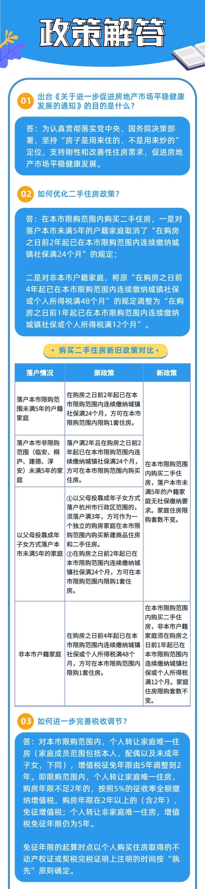 e公司讯,杭州市房地产市场平稳健康发展领导小组办公室发布《关于进一步促进房地产市场平稳健康发展的通知》,从优化二手住房交易政策、完善税收调节、更好满足三孩家庭购房需求等方面进一步完善房地产市场调控。《通知》明确优化二手住房交易政策。在本市限购范围内购买二手住房的,对落户本市未满5年的户籍家庭取消原“在购房之日前2年起已在本市限购范围内连续缴纳城镇社保满24个月”的规定;对非本市户籍家庭,将原“在购房之日前4年起已在本市限购范围内连续缴纳城镇社保或个人所得税满48个月”的规定调整为“在购房之日前1年起已在本市限购范围内连续缴纳城镇社保或个人所得税满12个月”。《通知》明确更好满足三孩家庭购房需求。一是符合条件的三孩家庭,在本市限购范围内限购的住房套数增加1套;二是符合条件的三孩家庭在报名参加新建商品住房公开摇号销售时,参照“无房家庭”优先摇号。
