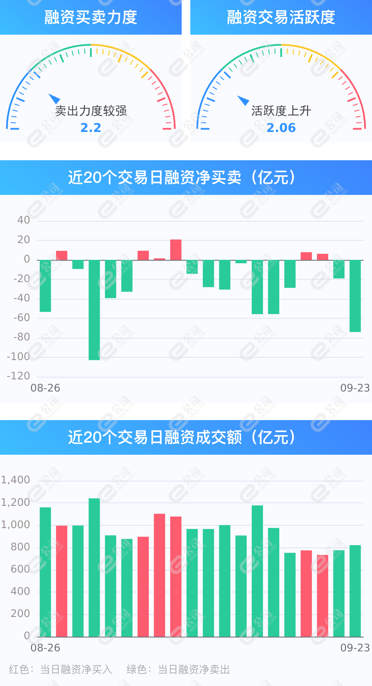 e公司讯,截至9月23日,上交所融资余额报7872.48亿元,较前一交易日减少41.24亿元;深交所融资余额报6898.18亿元,较前一交易日减少32.82亿元;两市合计14770.66亿元,较前一交易日减少74.06亿元,融资交易额821.34亿元,占A股成交额12.30%,其中融资买入额373.64亿元,融资偿还额447.70亿元,交易活跃度上升5.85%。(此稿由证券时报e公司写稿机器人“快手小e”完成。)