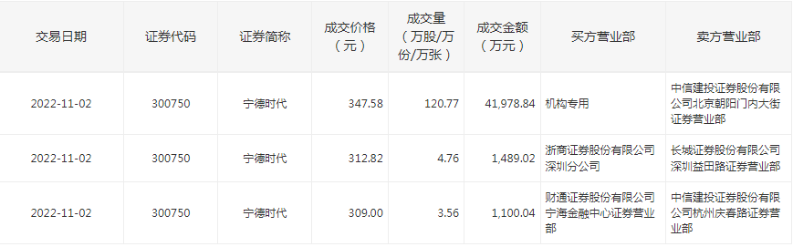 e公司讯,宁德时代今日出现三笔大幅折价大宗交易,合计成交4.46亿元。其中,中信建投北京朝阳门内大街证券营业部卖出4.2亿元,接盘方为机构,成交价每股347.58元。宁德时代股价今日收报391.5元/股。