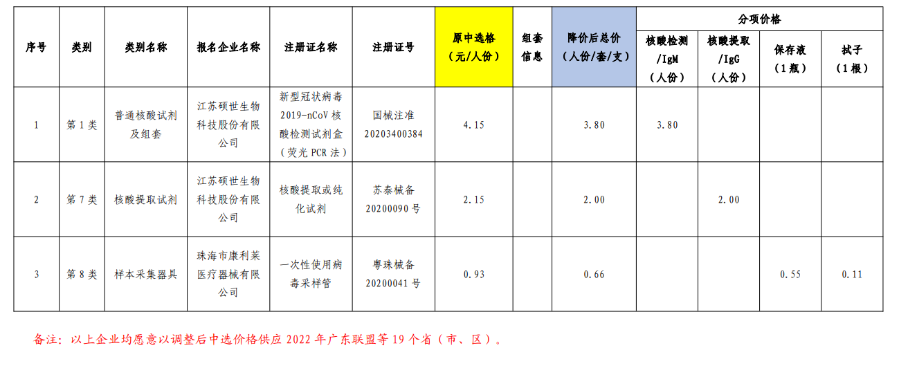 e公司讯,广东省药品交易中心发布关于调整江苏硕世等两家企业新冠病毒核酸检测试剂和配套耗材带量采购中选价格的通知。广东联盟新型冠状病毒(2019-nCoV)核酸检测试剂和相关耗材带量采购两家中选企业江苏硕世生物科技股份有限公司、珠海市康利莱医疗器械有限公司主动申请调整其中选品种价格。