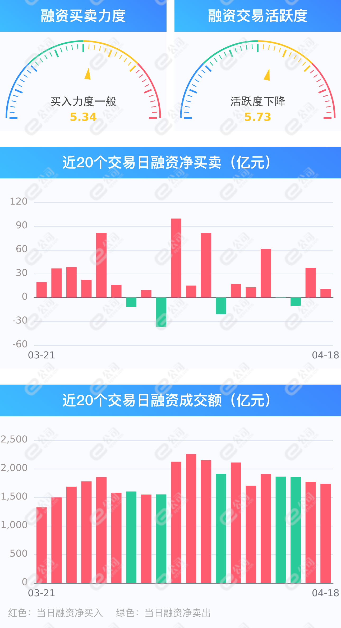 e公司讯,截至4月18日,上交所融资余额报8049.09亿元,较前一交易日增加2.26亿元;深交所融资余额报7380.04亿元,较前一交易日增加8.04亿元;两市合计15429.12亿元,较前一交易日增加10.30亿元,融资交易额1734.71亿元,占A股成交额16.37%,其中融资买入额872.51亿元,融资偿还额862.21亿元,交易活跃度下降1.93%。(此稿由证券时报e公司写稿机器人“快手小e”完成。)