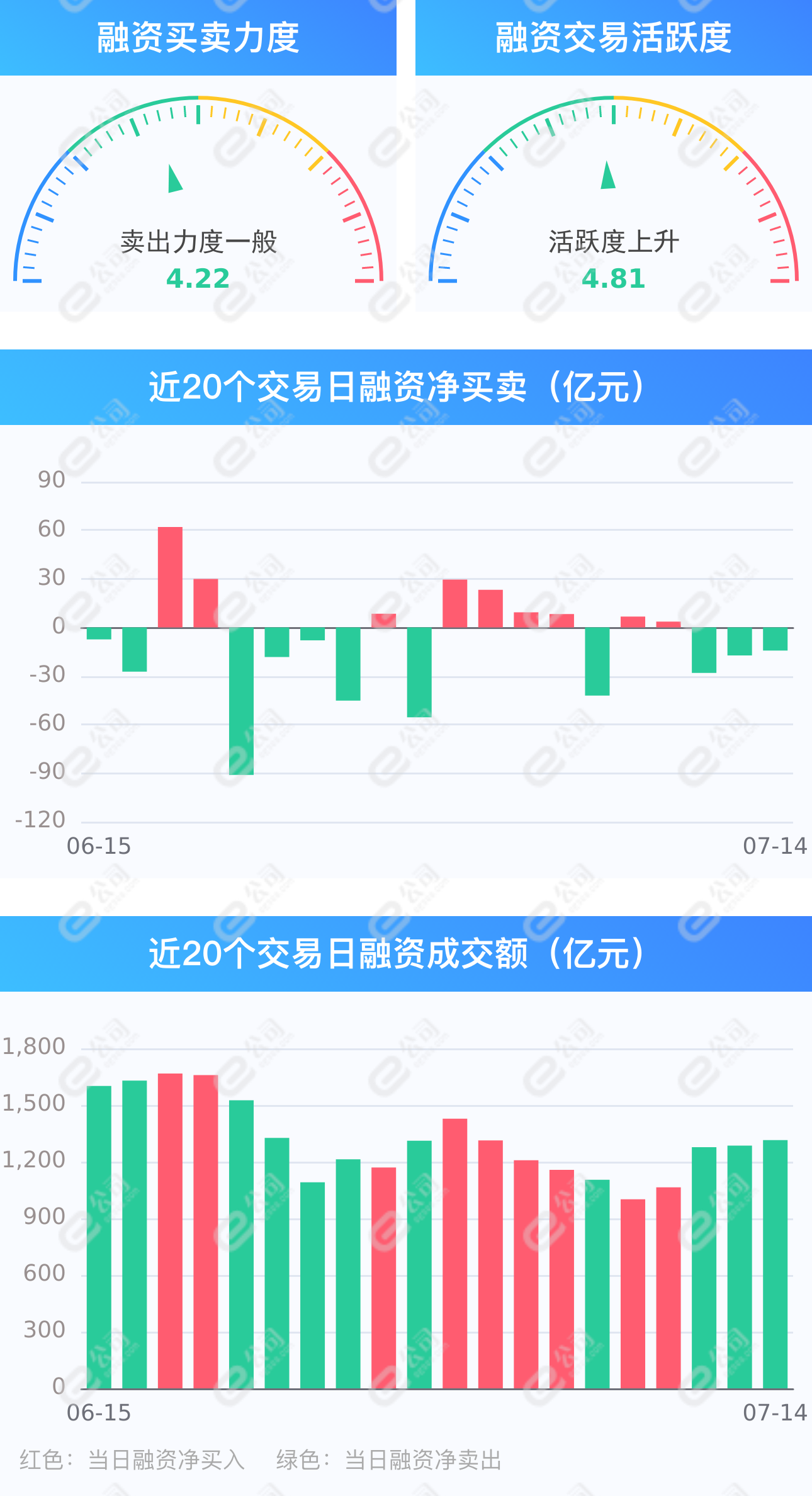 e公司讯,截至7月14日,上交所融资余额报7781.36亿元,较前一交易日减少13.2亿元;深交所融资余额报7150.13亿元,较前一交易日减少1.09亿元;两市合计14931.49亿元,较前一交易日减少14.28亿元,融资交易额1313.96亿元,占A股成交额14.24%,其中融资买入额649.84亿元,融资偿还额664.12亿元,交易活跃度上升2.25%。(此稿由证券时报e公司写稿机器人“快手小e”完成。)
