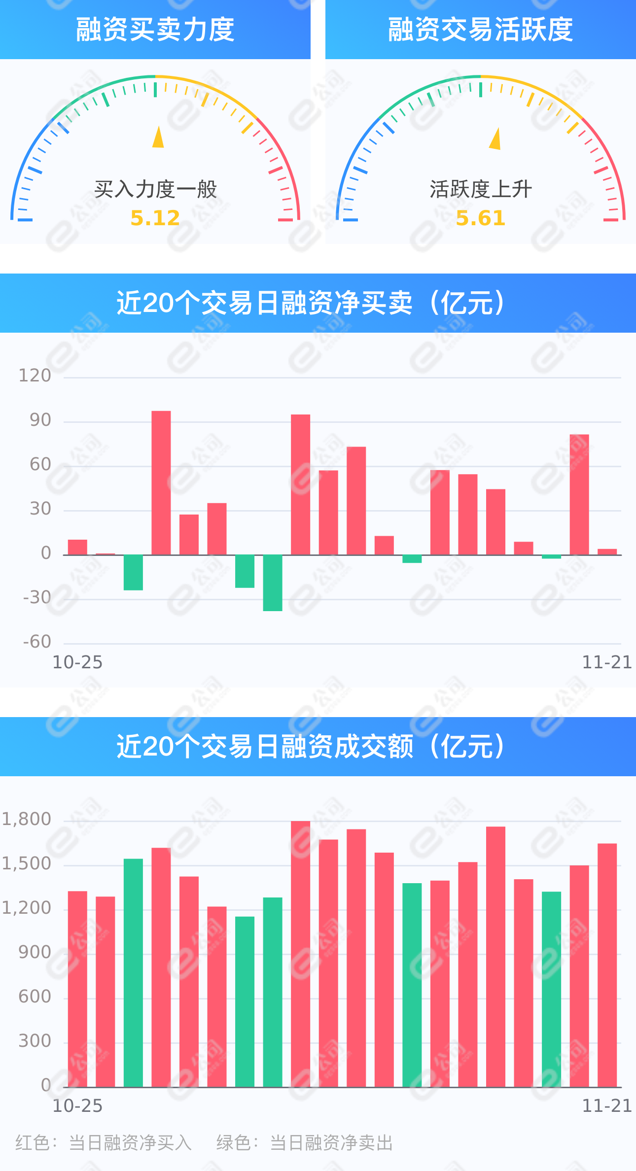 e公司讯,截至11月21日,上交所融资余额报8343.32亿元,较前一交易日减少9.37亿元;深交所融资余额报7599.19亿元,较前一交易日增加13.10亿元;两市合计15942.50亿元,较前一交易日增加3.74亿元,融资交易额1644.97亿元,占A股成交额16.48%,其中融资买入额824.36亿元,融资偿还额820.62亿元,交易活跃度上升9.91%。
