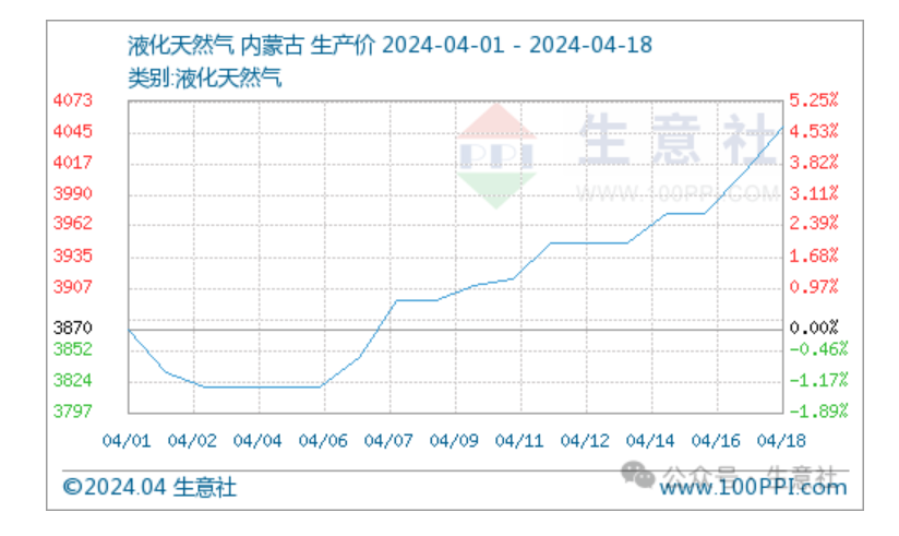 e公司讯,据生意社商品行情分析系统,本周国内液化天然气价格不断上涨。截至4月18日,国内液化天然气均价为4050元/吨,较4月11日均价3916元/吨,上涨3.42%。生意社分析师认为,近日进口气价格高涨刺激国产气行情上涨,加上供需端的有利支撑,国内液化天然气价格集中上行。技术方面看也是大概率向上运行。综上,预计短期国内液化天然气价格继续上涨为主。