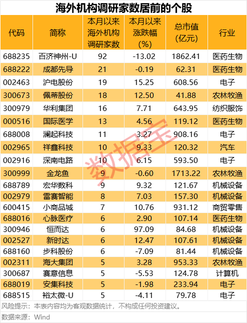 从行情来看,海外机构调研股本月以来普遍表现较好,平均涨幅达到4.8%,14股累计上涨10%以上,恒而达、埃夫特-U、海目星本月以来涨幅居前,分别为97.09%、17.03%、16.48%。