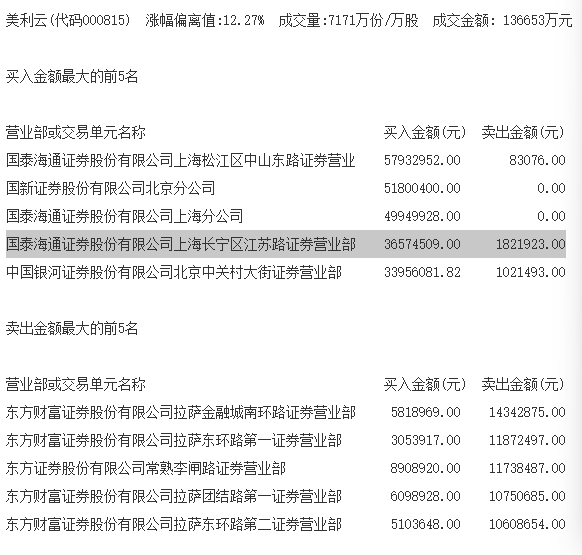 算力租赁概念股美利云今天连续第二个交易日涨停,当日成交13.7亿元,国泰海通证券上海长宁区江苏路证券营业部买入3657万元,卖出182万元。