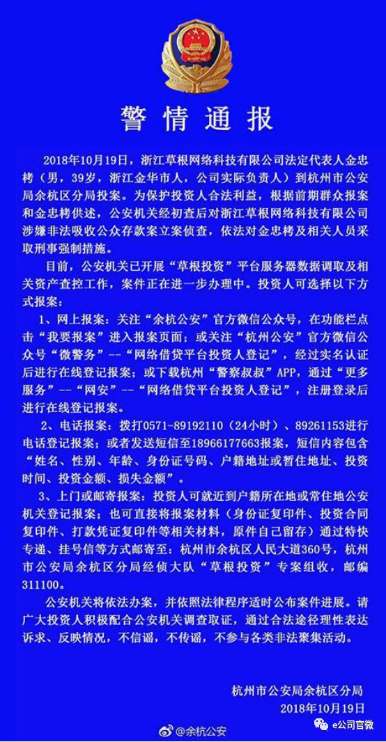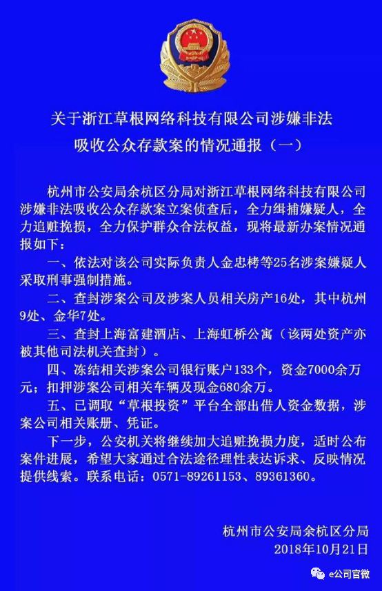 10月21日,杭州市公安局余杭分局发布公告,进一步通报草根投资涉嫌非法吸收公众存款案进展。目前,警方已依法对该公司实际负责人金忠栲等25名涉案嫌疑人采取强制措施,冻结资金7000余万元。